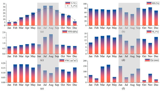 Monthly meteorological data statistics of the study area in 2022. In (a), the black curve characterizes the monthly soil temperature (Ts), while the bar graph characterizes the monthly mean temperature (T). In (b), the bar graph shows the relative humidity of air (RH), while (c) shows the water vapor pressure deficit (VPD). In (d), the bar graph shows the soil moisture (Ms). In (e), the bar graph represents the volumetric water content of soil (VWC), while (f) represents the precipitation (Ppt). The gray rectangular area highlights the drought–heatwave event. All abbreviations are shown in Table 1.
