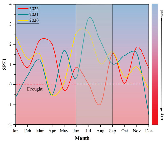 Comparison of the Standardized Precipitation–Evapotranspiration Index (SPEI) of Shanghai between 2022 and other years (2021, 2020) without extreme drought–heatwave events. The red curve in the graph represents the monthly SPEI in 2022, while the other curves represent the monthly SPEI in some normal years. The value of SPEI is based on 0; the higher the value, the wetter it is, while the lower the value, the drier it is. The drought event has an SPEI value under −0.5. The gray rectangular area highlights the period of drought–heatwave event. All abbreviations are shown in Table 1.