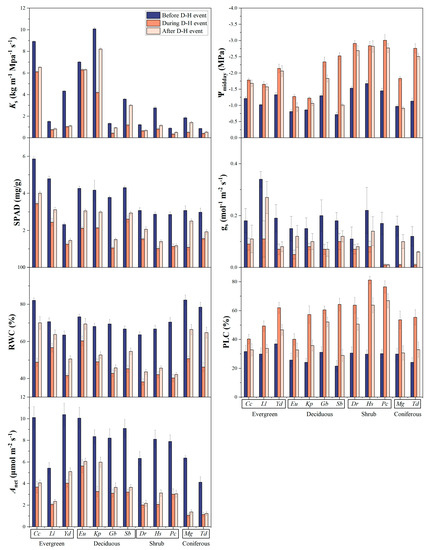 Compared with the broadleaved species, Mg and Td, as coniferous fir species, showed a significant drop in Ks, gs and Anet during the hot drought but significantly recovered their hydraulic traits in the post-hot-drought phase (Figure 6).