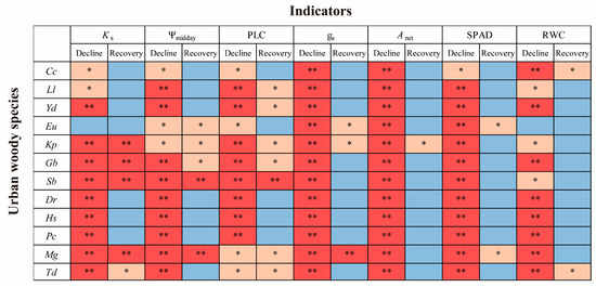 Significance of decline (during hot drought event vs. before hot drought event) and recovery (post-hot-drought event vs. during hot drought event) in the hydraulic- and photosynthesis-related physiological traits (Ks, Ψmidday, PLC, RWC, SPAD, gs, Anet) of 12 species (Kp, Cc, Ll, Sb, Eu, Yd, Gb, Hs, Pc, Dr, Mg, Td) under hot drought events. ** = p < 0.01 (red color), * = p < 0.05 (orange color), and blue color indicates little to no significance. All abbreviations are shown in Table 1.