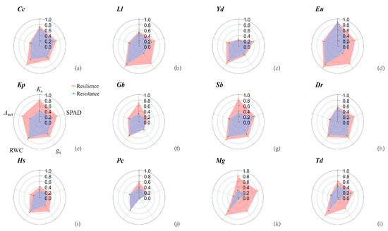 Radar charts (a–l) are used to represent the resistance and resilience of different indicators of the same tree species before and after drought–heatwave event. The larger the red area, the less severely damaged the tree and the stronger the resilience. The larger the blue area, the higher and stronger the resistance ability of the tree. All abbreviations are shown in Table 1.