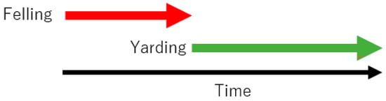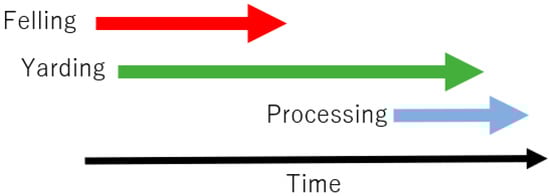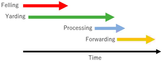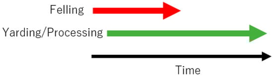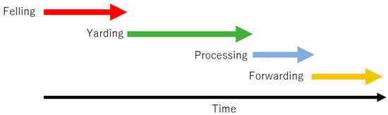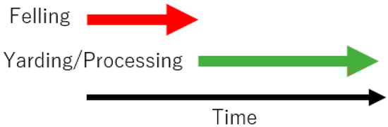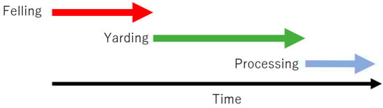 Forest harvesting systems were classified into two types, i.e., the serial and parallel production systems [32]. In the serial system the production processes are performed one after another in sequence (Figure 2). For example, after all the trees are felled by chainsaw, the yarding process starts. Conversely, in the parallel system the production processes are performed at the same time, either partially or completely (Figure 3). In this system, for example, trees are felled with a chainsaw while the yarding process is in progress. As shown in Figure 2, the total production time for the serial model (T0) is expressed by the following equation: