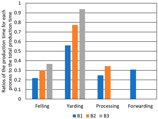 Figure 15 shows the variation of the ratios of the production time for each process to the total production time for the parallel models B1, B2, and B3. As shown in this figure, the ratios become higher as the number of production processes is reduced. The ratio of idle time for Model B1 is the highest among the three parallel models, and the ratio of idle time for felling is the highest among the four production processes in Model B1. As a result, the imbalance of production rates between processes is a fundamental problem in the parallel production systems typical in Japan.