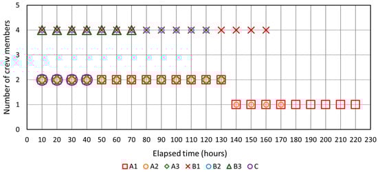 Variation in the number of crew members for each production model according to the elapsed time.
