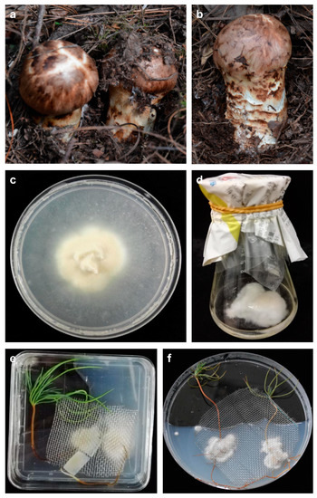 Three samples of T. matsutake were collected from coniferous forests in Nanhua county, Yunnan province, China, dried with silica gel, and preserved at the Institute of Applied Mycology at Huazhong Agricultural University (Figure 1a,b). The T. matsutake YN1 strain was isolated from a sporocarp of one of the three fresh samples. The mycelia of T. matsutake were cultured on P5 medium (pH 5.8) according to the formula reported by Chen et al. [30]. After being cultured in the dark at 24 °C for 2 months, the mycelial culture was used as a solid inoculant for mycorrhiza synthesis (Figure 1c,d). Subsequently, 8 to 10 small mycelial discs (diameter: 6 mm) from T. matsutake initially cultured colonies were placed into sterile 250 mL glass flasks with 100 mL of liquid P5 medium to culture the liquid mycelia in the dark at 24 °C. The obtained liquid mycelium culture was added into seedling pots as a supplementary liquid inoculum to maintain the activity and density of T. matsutake mycelia 45 days after the mycorrhizal seedlings’ transplantation.