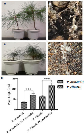 Effects of Tricholoma matsutake ectomycorrhiza on plant height and lateral root development of Pinus elliottii and Pinus armandii seedlings. (a,c) Ectomycorrhizal and non-mycorrhizal P. elliottii (a) and P. armandii (c) seedlings 18 months after transplantation. On the left is the non-mycorrhizal seedling and on the right is the mycorrhizal seedling inoculated with T. matsutake. (b,d) Shiro-like structures of mycorrhizal P. elliottii (b) and P. armandii (d) seedlings inoculated with T. matsutake. (e) Effects of T. matsutake ectomycorrhiza on plant height. Significant differences are detected by t-tests in GraphPad Prism v9.0.0. Data are expressed as the mean ± SE of 4 biological replicates (n = 4). ***, p < 0.0001. All these treatments were repeated four times with similar results.