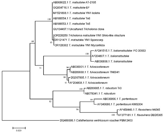 The T. matsutake sporocarps, mycelium cultures, mycorrhizae, and shiro-like structures were ground with an electric tissue grinding set (OSE–Y50, TIANGEN Co., Ltd., Beijing, China) to extract DNA following the protocol of CTAB (hexadecyltrimethylammonium bromide) [31]. The optimized polymerase chain reaction (PCR) was conducted using the primer pair ITS1F/ITS4R according to the previously reported method [13,31,33]. PCR without a DNA template was used as a negative control to avoid possible contamination. The PCR products were sequenced using amplified primers at Quintarabio Co., Ltd. (Wuhan, China). The representative contigs were selected and aligned to the fungal sequences against GenBank by blast. The original sequences in the present study were submitted to GenBank with accession numbers of MF521898 (YN1 isolate), OR121471 (YN1 parent sporocarp), OR128362 (YN1 mycorrhiza), and OR226259 (YN1 shiro-like structures).
