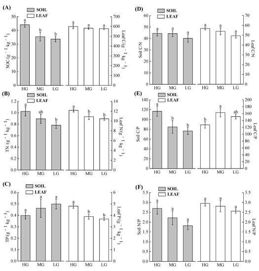 Rhizosphere soil and leaf nutrients and their ratios in P. massoniana families with different growth levels. Note: mean ± standard error, different lowercase letters indicated significant differences (p < 0.05) based on Duncan’s multiple range test. Note: TN, total nitrogen of the rhizosphere soil; TP, total phosphorus of the rhizosphere soil; C, carbon; C/P, carbon-to-phosphorus ratio; N/P, nitrogen-to-phosphorus ratio; C/N, carbon-to-nitrogen ratio; HG, high growth; MG, medium growth; and LG, low growth. The subgraphs letters denote (A) SOC and C (carbon); (B) TN, total nitrogen of the rhizosphere soil; (C) TP, total phosphorus of the rhizosphere soil; (D) C/N, carbon-to-nitrogen ratio; (E) C/P, carbon-to-phosphorus ratio; (F) N/P, nitrogen-to-phosphorus ratio.