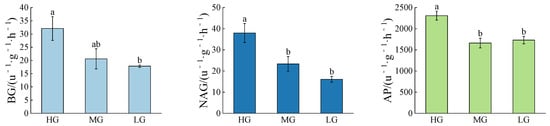 Furthermore, the acid phosphatase (AP) activity was found to be the highest among the extracellular enzymes analyzed in this study, with values averaging around 2000 u−1·g−1·h−1 (Figure 2). Notably, the AP activity in the rhizosphere soil of the HG family exhibited a significantly higher level compared to the MG and LG families, with an increase of approximately 40%. A similar pattern was observed in the activities of β-1,4-N-acetylglucosaminidase (NAG), with a much greater increase observed in the HG family ranging from 77% to 129% (Figure 2). It is worth mentioning that the HG family also exhibited higher activity of β-1,4-glucosidase (BG) compared to the LG family but showed no significant difference compared to the MG family (Figure 2).