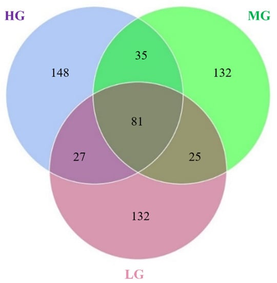 ASV Venn diagram of P. massoniana families with different growth levels. Note: HG, high growth; MG, medium growth; and LG, low growth.