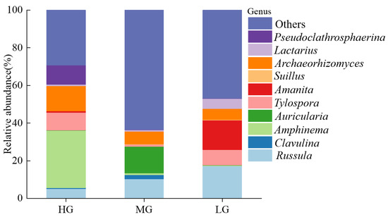 Relative abundance distribution of ECM fungal communities (genus level) of P. massoniana families with different growth levels. Note: All were the top 10 genera with average abundance > 0.1%. Note: HG, high growth; MG, medium growth; and LG, low growth.