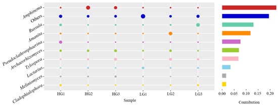 Using simper analysis, the Bray–Curtis dissimilarity index of ECM fungal community composition among the three families of P. massoniana was decomposed. The results indicated that the main contributor to this dissimilarity index was Amphinema (contribution: HG-MG 0.225, HG-LG 0.17). Additionally, other genera with an abundance of less than 0.1% and unidentified genera also made substantial contributions (contribution: HG-MG 0.25 and HG-LG 0.225) (Figure 5 and Figure 6). These findings underscored the distinctive composition and contribution patterns exhibited by ECM fungal genera within the HG family.