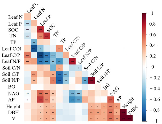 Pearson correlation test. Note: V, timber volume; Height, tree height; DBH, diameter at breast height; BG, β-1,4-glucosidase; NAG, β-1,4-N-acetylglucosaminidase; AP, acid phosphatase; TN, total nitrogen of the rhizosphere soil; TP, total phosphorus of the rhizosphere soil; C, carbon; C/P, carbon-to-phosphorus ratio; N/P, nitrogen-to-phosphorus ratio; C/N, carbon-to-nitrogen ratio. * represents p < 0.05, ** represents p < 0.01, *** represents p < 0.001.