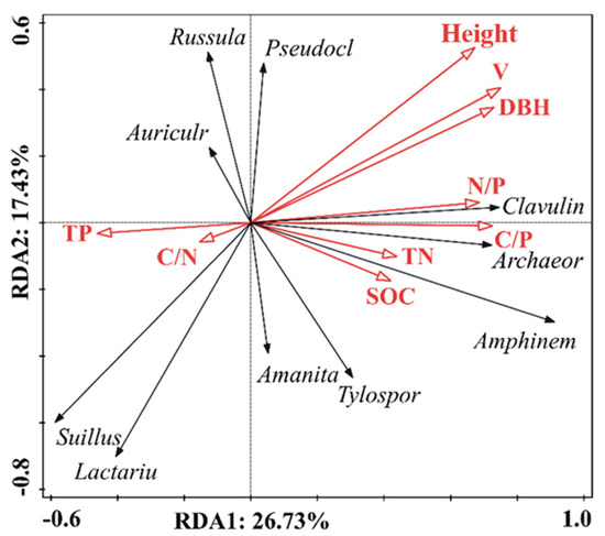 Redundancy analysis (RDA) was conducted with the ECM fungal abundance of P. massoniana as the response variable and soil chemical properties and tree growth performance as explanatory variables. The results showed that the first two axes of the RDA explained 44.16% of the total microbial variation (Figure 8). The Monte Carlo test indicated significant correlations (p < 0.05) between tree growth performance (Height, DBH, and V), soil total nitrogen (TN), soil N/P, and ECM fungal community composition (Table 2).