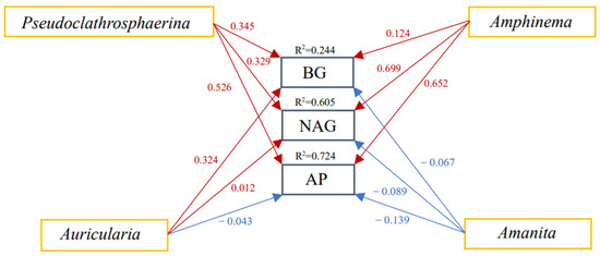 Structural equation model of the dominant genera and extracellular enzyme activities of P. massoniana. Note: x2 = 8.752, DF = 9, p = 0.460, GFI = 0.925, RMSEA = 0.000. The red and blue arrows represent positive and negative pathways, respectively. The numbers adjacent to the arrows are standardized path coefficients. Note: BG, β-1,4-glucosidase; NAG, β-1,4-N-acetylglucosaminidase; AP, acid phosphatase.