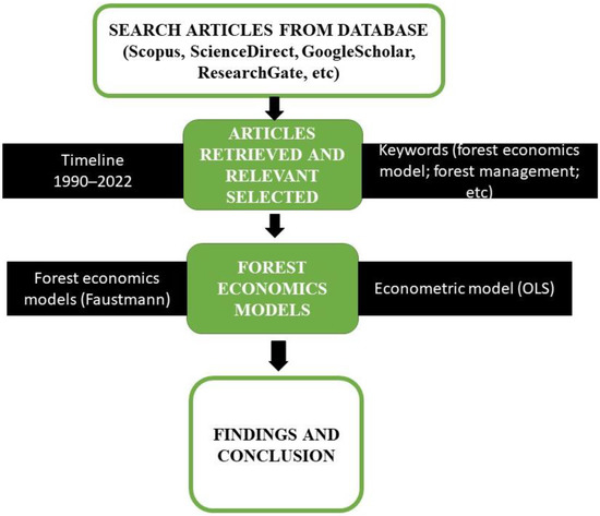 Data were collected using two methods (qualitative and quantitative). The first part of the study involved searching databases for the relevant literature to fulfill the objectives of this study. The qualitative technique used forest economics models emphasizing the Faustmann basic economic model and forest management, and the quantitative technique and analysis included building an econometric model that assesses the influence of selected variables and CO2 emissions (Figure 2).
