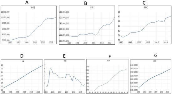 Trends of the Variables (1990–2018). (A) China’s CO2 emissions (kilotonnes) in the last decades. (B) China’s footprints on forest products (% of ecological footprints (gha). (C) China’s fossil fuel consumption (% of total energy). (D) China’s forest land (% of land area) (E) Direct investments from foreign countries (net inflows (% of GDP). (F) China’s Gross Domestic Products (US$) (G) China’s population (total population).