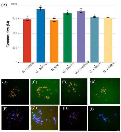 Genome size and chromosomal ploidy analysis of the various Gleditsia species. (A): A box plot showing the genome sizes within the Gleditsia genus; (B): fluorescence in situ hybridization (FISH) of the telomere of G. delavayi; (C): FISH of the telomere of G. japonica; (D): FISH of the telomere of G. sinensis; (E): FISH of the telomere of G. australis; (F): FISH of the G. delavayi rDNA; (G): FISH of the G. japonica rDNA; (H): FISH of the G. sinensis rDNA; (I): FISH of the G. delavayi rDNA. In (A), error bars indicated the standard error. The least significant difference (LSD) was used to compare the means at the 0.05 probability level, different lowercase letters indicate significant differences at p < 0.05. In (B–E), the original telomeric repeats of in situ hybridization were green; in (F–I), the results of FISH in the rDNA were red, and the results of FISH in the 18S rDNA were green. The scale bars were at 5 um.