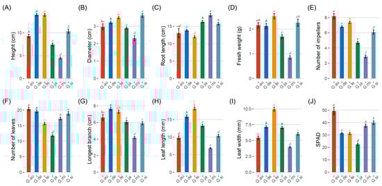 The morphological indicators for the Gleditsia seedlings. (A): Plant height; (B): ground diameter; (C): root length; (D): fresh weight; (E): number of impellers; (F): number of leaflets on the longest compound leaf; (G): longest branch; (H): leaf length; (I): leaf width; (J): SPAD. Note: In (A–J), error bars indicate the standard error, different lowercase letters indicate significant differences at p < 0.05. G.au: G. australis; G.de: G. delavayi; G.fe: G. fera; G.ja: G. japonica; G.mi: G. microphylla; G.si: G. sinensis. The number of seedlings measured for each species was n = 30.