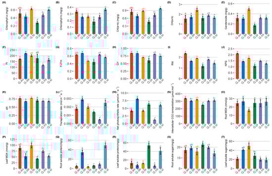 The photosynthetic and physiological characteristics for the Gleditsia seedlings. (A): Chlorophyll a; (B): chlorophyll b; (C): Chl(a+b); (D): chla/b; (E): carotenoids; (F): Ft; (G): Fv/Fm; (H): QY; (I): Rfd; (J): NPQ; (K): qN; (L): transpiration rate; (M): net photosynthetic rate; (N): intercellular CO2 concentration; (O): root MDA; (P): leaf MDA; (Q): root soluble protein; (R): leaf soluble protein; (S): root soluble sugar; (T): leaf soluble sugar. Note: Error bars indicate the standard error, different lowercase letters indicate significant differences at p < 0.05. G.au: G. australis; G.de: G. delavayi; G.fe: G. fera; G.ja: G. japonica; G.mi: G. microphylla; G.si: G. sinensis. The number of measured samples of each species was n = 3.