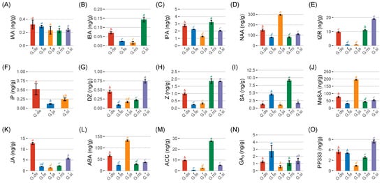 Differences in the hormone contents of seedlings. (A): IAA content; (B): IBA content; (C): IPA content; (D): NAA content; (E): tZR content; (F): iP content; (G): DZ content; (H): Z content; (I): SA content; (J): MeSA content; (K): JA content; (L): ABA content; (M): ACC content; (N): GA3 content; (O): PP333 content. Note: Error bars indicate the standard error, different lowercase letters indicate significant differences at p < 0.05. G.au: G. australis; G.de: G. delavayi; G.fe: G. fera; G.ja: G. japonica; G.mi: G. microphylla; G.si: G. sinensis. The number of measured samples of each species was n = 3.