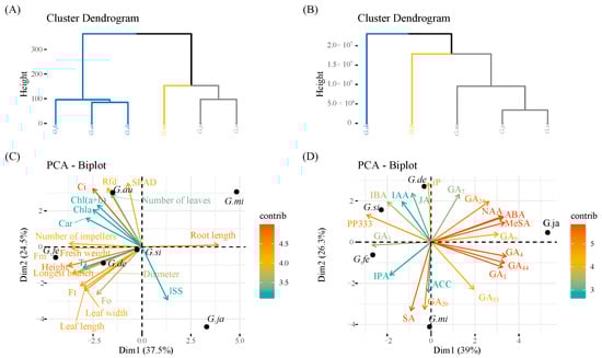 Cluster analysis and PCA of the samples. (A): Cluster analysis of the seedling phenotypes using physiological indexes; (B): cluster analysis of the seedling hormones; (C): PCA of the seedling phenotype using physiological indicators; (D): PCA analysis of the seedling hormones. Note: In (A,B), the clustering method used was hclust. In (C,D), the top-20 list of contributors is shown. G.au: G. australis; G.de: G. delavayi; G.fe: G. fera; G.ja: G. japonica; G.mi: G. microphylla; G.si: G. sinensis.