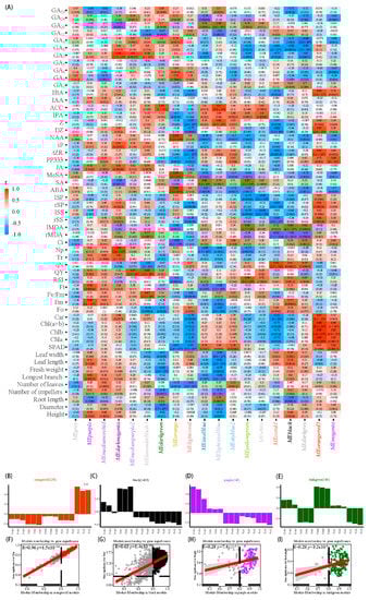 Plants’ responses to growth and development are coordinated through the regulation of numerous complex and, usually, interconnected signal transduction pathways that are found in metabolic networks. In order to understand the differences in gene expression between fast-growing and slow-growing plants, we conducted RNA-seq sequencing on the stem tips of different Gleditsia species. Comparative transcriptome analysis revealed that 408 DEGs were found between the fast-growing wood and slow-growing wood areas in Pinus massoniana []. As an invasive species, Mikania micrantha exhibits rapid growth. WGCNA analysis shows that many of the key genes that were highly correlated with Mikania micrantha leaf and stem tissues were mainly involved in chlorophyll synthesis, the response to auxin, the CAM pathway, and other photosynthesis-related processes, which promoted this fast growth []. A BEL1-like transcription factor, PeuBELL15, was up-regulated in the faster-growing genotype of Populus []. Based on the WGCNA analysis, the selected genes were divided into 19 modules (Figure 6A). The orangered3 module was significantly positively correlated with Chla, Chlb, and Chl(a+b), while the gene within the orangered3 module showed a relatively high expression in the G. sinensis samples (Figure 6B). GS and MM were highly correlated (r = 0.96, p = 1.5 × 10−136) (Figure 6F), indicating that the highly co-expressed genes contained within the orangered3 module might cause variations in Chla level. The gene found within the black module showed relatively high expression in the G. fera samples (Figure 6C). Proteasome (ko03051), phenylpropanoid biosynthesis (ko00940), cytochrome P450 (ko00199), the biosynthesis of various plant secondary metabolites (ko00999), and other pathways showed enrichment in the black module. The DEGs involved in cell wall biosynthesis, expansion, phytohormone biosynthesis, signal transduction pathways, flavonoid biosynthesis, and phenylpropanoid biosynthesis were significantly enriched in Salix matsudana plant-height mutants []. Phenylpropanoid biosynthesis is closely related to wood formation [] and plant height []. A correlation was found between MM in the black module and GS in the trait GA3 (r = 0.63, p = 1.4 × 10−162) (Figure 6G). This indicates that the fast-growing characteristic of G. fera may be related to its content level of GA3.