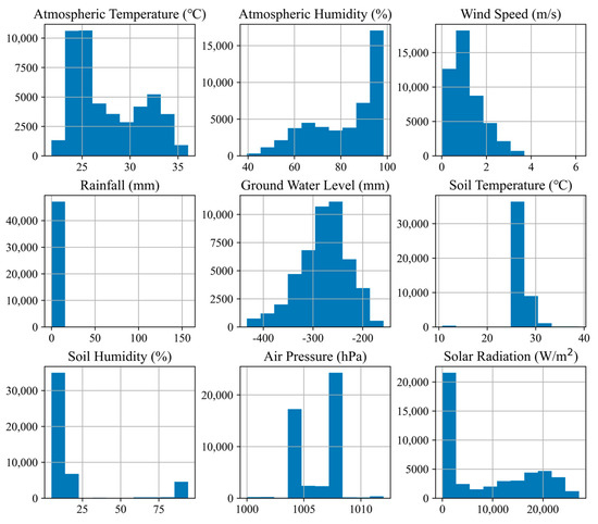 Figure 1 shows the architecture of the IoT system, which was deployed at RMFR, Kuala Selangor, Malaysia, with the north latitude of 3°27′58″ and the east longitude of 101°26′31″. The IoT system mainly comprises sensor nodes, including humidity, temperature, and water level sensors and LoRa antennas, which transmit the monitored peatland soil parameter data to the LoRa gateway located in the observation tower. Furthermore, the weather station is also located in the observation tower. Finally, LoRa transmission technology and LTE cellular network transmission display the peatland forest data monitored by the IoT system on a GUI page. Moreover, it was put into use on 17 January 2020. More information based on the IoT system has been described in detail in our team’s previous publication [19,20,21]. The histogram of the data used in this paper is shown in Figure 2.