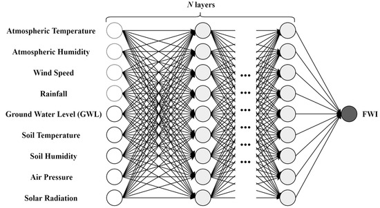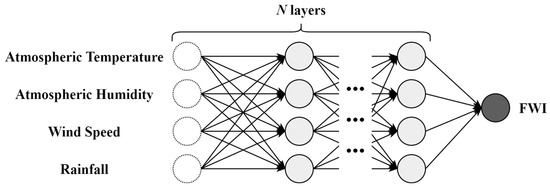 In the Canadian Fire Weather Index (FWI) system proposed by Van Wagner [27] in 1987, the FWI is determined by four meteorological parameters: atmospheric temperature, humidity, wind speed, and rainfall. According to the four meteorological parameters of the Canadian Fire Weather Index model, a four-input N-layer neural network for predicting the FWI is proposed in this paper, as shown in Figure 3.