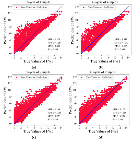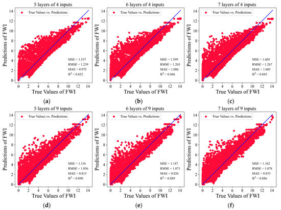Figure 7 compares the performance of different layers (ranging from three to seven layers) of two input modes (namely, four inputs and nine inputs) for predicting the FWI. The results indicate that the performance of predicting the Fire Weather Index (FWI) using neural networks is better with nine inputs compared to four inputs, regardless of the number of layers. The evaluation metrics, including mean squared error (MSE), root mean squared error (RMSE), mean absolute error (MAE), and R-squared (R2), consistently demonstrate the superiority of the nine-input models over the four-input models. Figure 7a shows that with the increase in the number of layers, the mean square error of the two input modes starts to decrease, and the lowest point reached by the five layers is 1.537 for the four inputs and 1.147 for the nine inputs. However, the mean square error of the structure starts to increase from the five layers to the seven layers, which is a manifestation of the lower prediction accuracy. The same performance trend occurs in the correlation of different layers shown in Figure 7d. At the five layers, four inputs and nine inputs reach the highest correlation, namely 0.846 for four inputs and 0.886 for nine inputs.