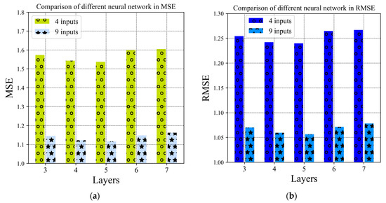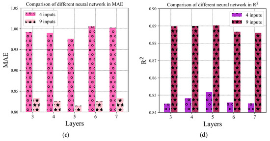 Performance of different neural networks. (a). 5-layer 4-input, (b). 6-layer 4-input, (c). 7-layer 4-input, (d). 5-layer 9-input, (e). 6-layer 9-input, (f). 7-layer 9-input.