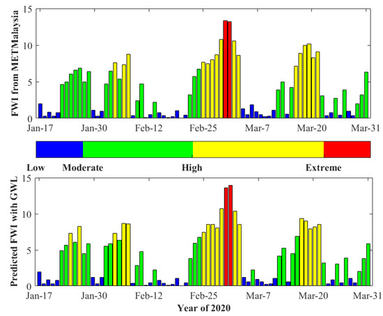 Figure 8 compares the Fire Weather Index (FWI) predicted by a nine-input, five-layer neural network and the FWI published by METMalaysia between 17th January and 31st March 2020. The upper subplot displays the distribution of the FWI published by METMalaysia, while the lower subplot shows the FWI predicted by the neural network. The color bar in the middle of the figure represents the FWI risk level, with blue indicating low risk (0–2), green indicating moderate risk (2–7), yellow indicating high risk (7–13), and red indicating extreme risk (>13). Overall, the color zones in the upper and lower subplots are similar, except for some discrepancies on 25th and 27th January, where the predicted FWI shifted from green to yellow, and on 6th March, where a blue risk level was predicted as green. This suggests that the neural network can effectively predict the FWI levels and is in agreement with the published data.
