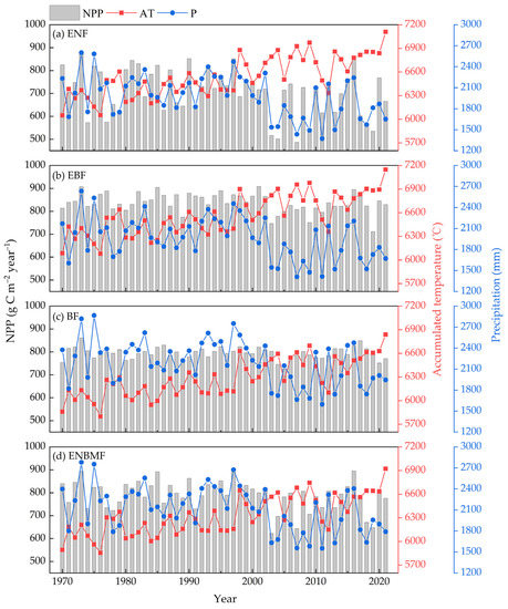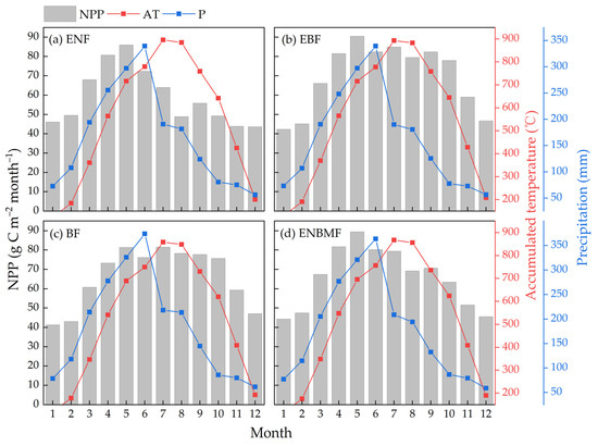 The NPP of ENF had a strong positive correlation with precipitation and no significant correlation with AT at the inter-monthly scale (Figure 5a and Figure 6a), causing the NPP to decline with precipitation from July to August for many years. The NPP of BF and EBF exhibited the greatest positive correlation with AT; therefore, their NPP did not follow a significant decrease in precipitation from July to August. The NPP of the ENBMF was driven by temperature and precipitation; therefore, the inter-month NPP variation was between those of ENF and EBF.