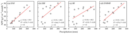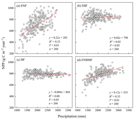 In the EBF and ENBMF, NPP exhibited a relatively significant (p < 0.01) positive correlation with precipitation (Figure 5a,d), with R2 of 0.33, which is consistent with the similarity of the interannual variation curves of NPP with precipitation for both types (Figure 3a,d). The NPP of ENF increased significantly with increasing precipitation, and the NPP of ENBMF increased slowly with increasing precipitation. In this region, the effect of precipitation on NPP accumulation is not major in the EBF. Meanwhile, the correlation between NPP and precipitation is not significant in the BF.