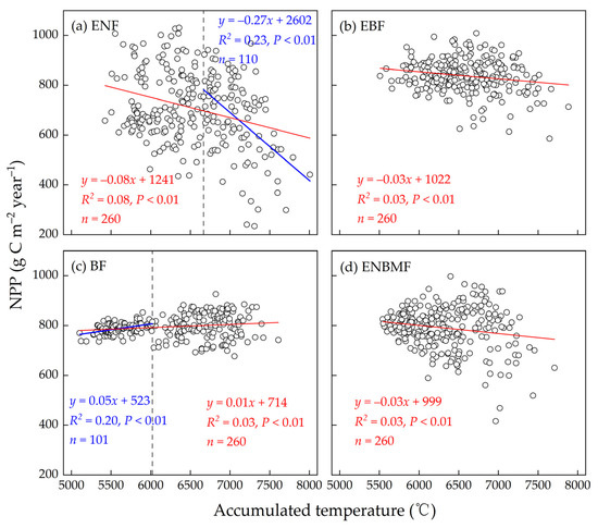 There was a negative correlation between NPP and AT in ENF, EBF, and ENBMF (Figure 6a,b,d), i.e., NPP decreased with increasing AT. Among the forest types, the NPP of ENF exhibited a significant decreasing trend with decreasing AT, especially when AT > 6660 degrees C year−1; the fitted relationship between NPP and AT was significantly enhanced (R2 = 0.23), i.e., the trend of decreasing NPP with the increasing AT was significantly enhanced. However, the NPP of the EBF and ENBMF slowly decreased with increasing AT; the NPP of BF exhibited a positive correlation with AT, i.e., the NPP of BF decreased slowly with increasing AT. The trend of increase in the NPP of BF with increasing AT was significantly enhanced when the AT was not abundant in the current year (AT < 6030 degrees C year−1) (Figure 6c).