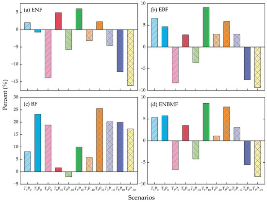 Combined scenarios (T1P10, T1P−10, T3P10, T3P−10, T6P10, T6P−10): In the T1P10, T1P−10 scenarios (i.e., a 1 °C temperature increase and a 10% increase or decrease in precipitation), the NPP of EBF, BF, and ENBMF demonstrated an increasing trend (Figure 9b–d). However, when precipitation decreased by 10%, the NPP of the ENF decreased significantly (Figure 9a). The NPP of the four forest types showed similar changes in the T3P10 and T3P−10 scenarios as those in the T1P10 and T1P−10 scenarios; the NPP of the BF increased significantly under T3P10, T3P−10 scenarios compared to T1P10, T1P−10 scenarios. The NPP of the other three forest types decreased under the T3P10 scenario compared to the T1P10 scenario, and NPP decreased under T3P−10 scenario compared to T1P−10 scenario. In addition, except for the BF, the NPP of the other three forest types decreased significantly under the T6P10, T6P−10 scenarios (i.e., a 6 °C rise of temperature and a 10% increase or decrease in precipitation).