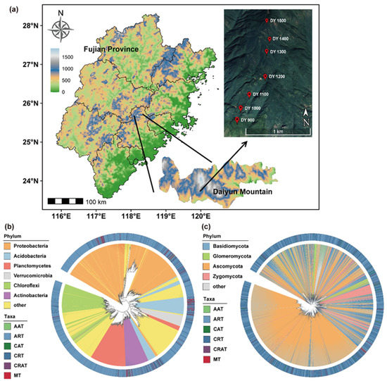 The elevation map of the sampling sites in southeast China (a). Phylogenetic distributions for the bacterial (b) and fungal (c) phylum, the annulus shows each OTU classified by AAT, ART, CAT, CRT, CRAT and MT. AAT: absolutely abundant taxa; ART: absolutely rare taxa; CAT: conditionally abundant taxa; CRAT: conditionally rare or abundant taxa; CRT: conditionally rare taxa; MT: moderate taxa. AAT and CAT were collectively considered as AT (abundant taxa), ART and CRT as RT (rare taxa). DY 900 indicates the elevational sample site at the elevation of 900 m in Daiyun mountain, and so on.