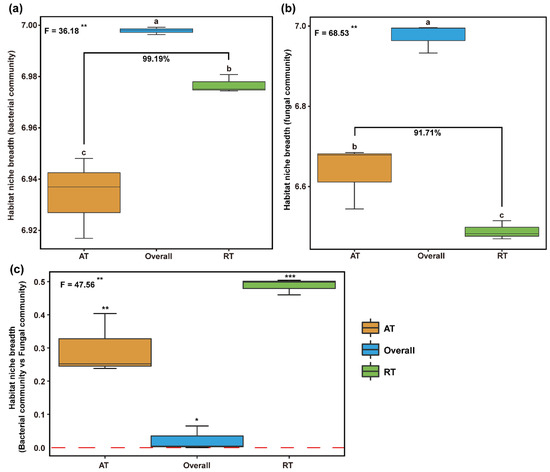 The habitat niche breadth of the bacterial (a) and fungal (b) community along the elevational gradient, and comparison between them (c). AT: abundant taxa; RT: rare taxa; Overall: all taxa. The letters above bars indicate the significance (* p < 0.05) among AT, Overall, RT for bacterial (a) and fungal (b) community, while the asterisks above bars (c) indicate the differences (* p < 0.05, ** p < 0.01, *** p < 0.001) in the habitat niche breadth between bacterial and fungal community. The line between AT and RT indicate the niche overlap.