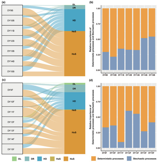Variations between microbial assembly processes (a,c) and elevations, and the relative importance of deterministic and stochastic processes in bacterial (b) and fungal (d) community assembly along the elevational gradient. HoS: homogeneous selection; HeS: heterogeneous selection; HD: homogenizing dispersal; DL: dispersal limitation; DR: drift. DY9B indicates that the bacterial community at the elevation of 900 m in Daiyun mountain, and so on.