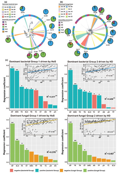 Of the bacterial and fungal bins, ten bins controlled by two major assembly processes were selected, respectively. The 10 bacterial bins constituted 19.3% of the total bacterial abundance, with 49.4% and 58.6% contributions for HoS and HD (Table S2a), respectively. Of these, five bins were mainly controlled by HoS (Group 1B), and five mainly by HD (Group 2B, Figure 4a). Comparatively, the 10 fungal bins accounted for 30.0% of the total fungal abundance, with 60.7% and 55.6% contributions for HoS and HD (Table S2b), respectively. Of these, five bins were mainly controlled by HoS (Group 1F), and five mainly by HD (Group 2F, Figure 4b). The selected bins (Group 1B, Group 2B, Group 1F, and Group 2F) were deemed the dominant microbial taxa. The dominant bacterial taxa controlled by HoS and HD included Proteobacteria, Acidobacteria, Actinobacteria, Verrucomicrobia, and Firmicutes (Table S3a). Additionally, the dominant fungal taxa controlled by HoS and HD included Basidiomycota, Ascomycota, and Zygomycota (Table S3b). More importantly, the dominant microbial taxa controlled by HoS and HD primarily belonged to rare taxa (Table S3).