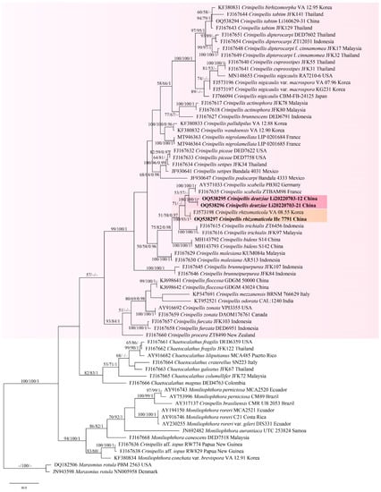 Phylogenetic analyses of Crinipellis and Marasmius were performed separately based on the ITS sequences. Marasmius rotula and C. zonata (Peck) Pat. were selected as the outgroups for the two datasets, respectively. The ITS sequences were aligned using MAFFT v.74 [] with the G-INS-I iterative refinement algorithm and optimized manually in BioEdit v.7.0.5.3. Maximum parsimony (MP), maximum likelihood (ML) analyses, and Bayesian inference (BI) were carried out by using PAUP* v.4.0b10, RAxML v.8.2.10, and MrBayes 3.2.6, respectively. The best-fit substitution model was estimated with jModeltest v.2.17. Detailed methods of the analyses referred to Li et al. []. MP, ML, and BI were carried out for the Crinipellis dataset, while only ML was applied to the Marasmius dataset. Four Markov chains were run for 2,000,000 for the Crinipellis dataset until the split deviation frequency value was lower than 0.01.