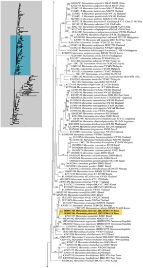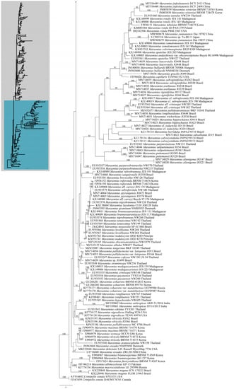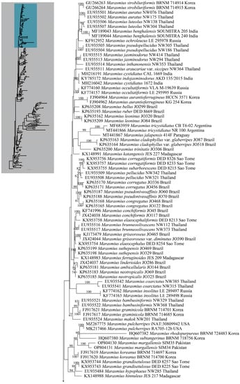 The species of Marasmius sensu lato are commonly found on leaves, and wood debris in forest litter, and numerous species were described under the genus. Although many species have been transferred to many other genera, the infrageneric classification of Marasmius sensu stricto is still unclear []. The ITS sequences are very helpful for species-level investigations, and many cryptic species were discovered based on a single gene. However, other loci, especially the protein-coding genes, should be used in future studies in order to resolve the phylogeny of Marasmius s.s. and its related genera.