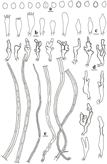 Microscopic structures of Crinipellis deutziae (Li20220703-12, holotype). (a) Basidiospores. (b) Basidia and basidioles. (c) Pleurocystidia. (d) Cheilocystidia. (e) Pileus hairs. Bars: a–e = 10 µm. Drawn by Hai-Jiao Li.