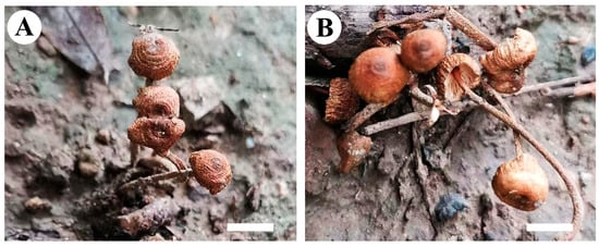 Basidiocarps of Crinipellis rhizomaticola ((A,B) He 7791, bar = 5 mm).