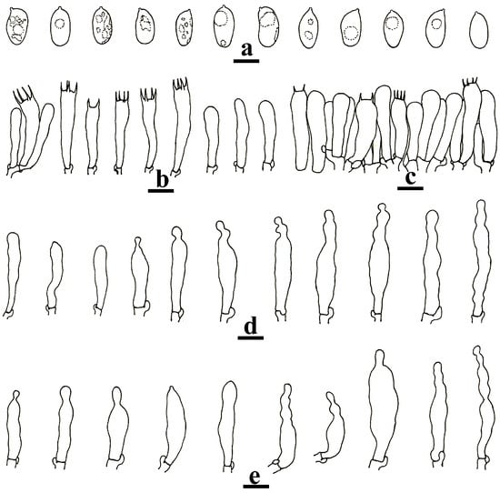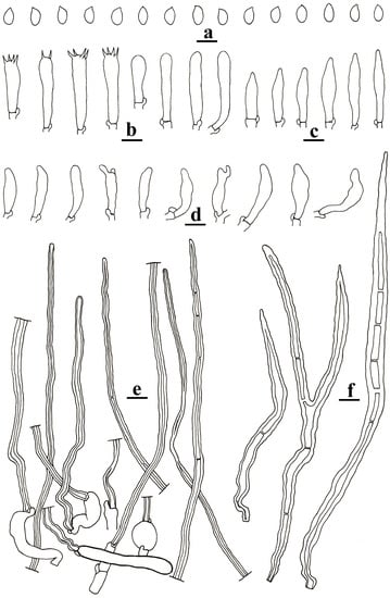 Remarks: when compared to the type description, the Chinese collection has slightly shorter and wider basidiospores (7–9.2 × 4.5–5.7 µm vs. 8.5–10 × 4–5 µm, []), cheilocystidia with fewer projections, fusoid pleurocystidia, and shorter stipe hairs []. In the phylogenetic tree (Figure 1), the Chinese sample (He 7791) and the type specimen (VA 08.55 or BRNM712570) of the species formed a strongly supported lineage.