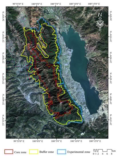 To enhance the management of the nature reserve, the overall plan for the Dali Cangshan Erhai National Nature Reserve (1996–2010) was issued in 2002. This plan divided the Cangshan mountain into three functional zones: core zone, buffer zone, and experimental zone (Figure 1). In the core zone, aside from essential positional monitoring, scientific investigations, and research activities, no facilities or activities that could impact or disturb the ecological environment are permitted. The buffer zone is designated for organized scientific research, experimental observations, necessary monitoring projects, field patrols, and the construction of protective facilities. The experimental zone serves as areas for protected development and can be moderately used for scientific experiments, educational visits, community co-management, and eco-tourism projects.