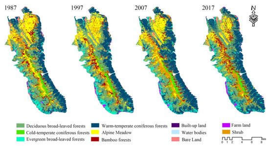 Seasonal variations often introduce errors in landscape extraction and change detection [29]. To mitigate this, we used cloud-free images collected exclusively during the autumn seasons of four selected years (1987, 1997, 2007, and 2017) for vegetation extraction, thereby avoiding uncertainties caused by seasonal changes [3,30]. In this study, we established an interpretive sign information database and selected training samples by combining field survey data and historical imagery from Google Earth. We employed Support Vector Machine (SVM) to categorize the landscape in the study area into eleven types (Figure 2): alpine meadow (AM), shrub (SH), deciduous broad-leaved forest (DBLF), cold-temperate coniferous forest (CTCF), evergreen broad-leaved forest (EBLF), warm-temperate coniferous forest (WTCF), bamboo forest (BF), built-up land (BUL), farm land (FL), bare land (BL), and water bodies (WB). The accuracy of interpretation exceeded 82%, meeting the precision requirements of the study.