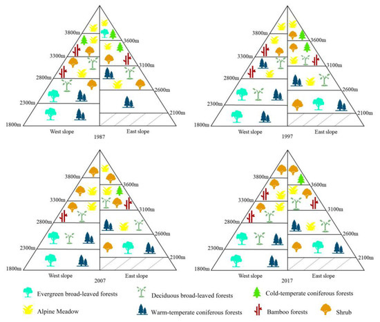 The landscape distribution of the Cangshan mountain in 1987, 1997, 2007, and 2017 is shown in Figure 2. Among the four analyzed years, the Cangshan mountain had less than 4% coverage of BUL, FL, BL, and WB, with over 96% covered by vegetation. The dominant vegetation types were WTCFs, DBLFs, BFs, and AM (Figure 2). Figure 3 reveals the typical vertical zonation pattern of vegetation in the Cangshan mountain. EBLFs were distributed between 1800–2800 m on the western slope and 2100–2600 m on the eastern slope. DBLFs were found between 2300–3300 m on the western slope and 2600–3600 m on the eastern slope. BFs were distributed between 2800–3800 m on the western slope and 3100–3600 m on the eastern slope. CTCFs were observed between 3300 m and the mountain top on the western slope, as well as between 3100 m and the mountain top on the eastern slope. AMs were present between 2800 m and the mountain top on the western slope, and between 2600 m and the mountain top on the eastern slope. SHs were distributed between 2300 m and the mountain top on the western slope, and between 2100 m and the mountain top on the eastern slope. WTCFs were found between 1800–2300 m on the western slope and 2100–3100 m on the eastern slope.
