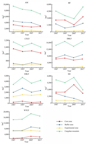 The areas of different vegetation types in the Cangshan mountain underwent changes between 1987 and 2017 (Figure 4). In the Cangshan mountain, over the 30-year period, there was a decrease in the coverage areas of CTCFs, AMs, and SHs, with reductions of 19.82%, 27.11%, and 42.67%, respectively. Conversely, there was an increase in the distribution areas of DBLFs, WTCFs, BFs, and EBLFs, with increases of 14.89%, 17.82%, 20.10%, and 21.69%, respectively. Figure 4 also illustrates the changing distribution areas of vegetation types within different functional zones from 1987 to 2017. Examining the trends from 1987 to 2017, the core zone exhibited an increase in the distribution areas of EBLFs, WTCFs, and BFs, while the distribution areas of AMs, SHs, and CTCFs decreased, with BFs displaying the largest increase. In the buffer zone, there was an increase in the distribution areas of EBLFs, DBLFs, WTCFs, and BFs, while the distribution areas of AMs, SHs, and CTCFs decreased. WTCFs and DBLFs exhibited the largest increases in this zone. In the experimental zone, there was an increase in the distribution areas of EBLFs, CTCFs, DBLFs, and BFs, while the distribution areas of AMs, SHs, and WTCFs decreased. EBLFs showed the greatest increase in this zone.