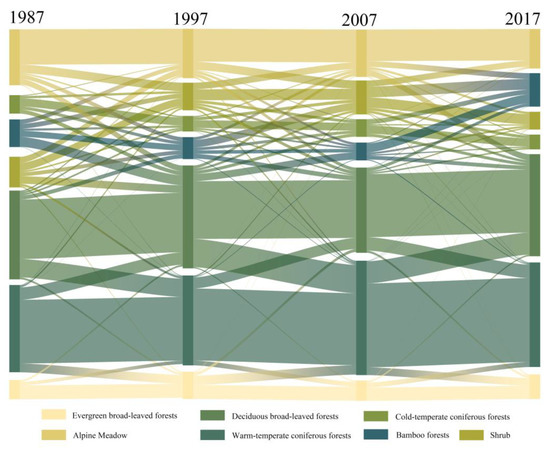 Changes in the distribution areas of different vegetation types from 1987 to 2017.